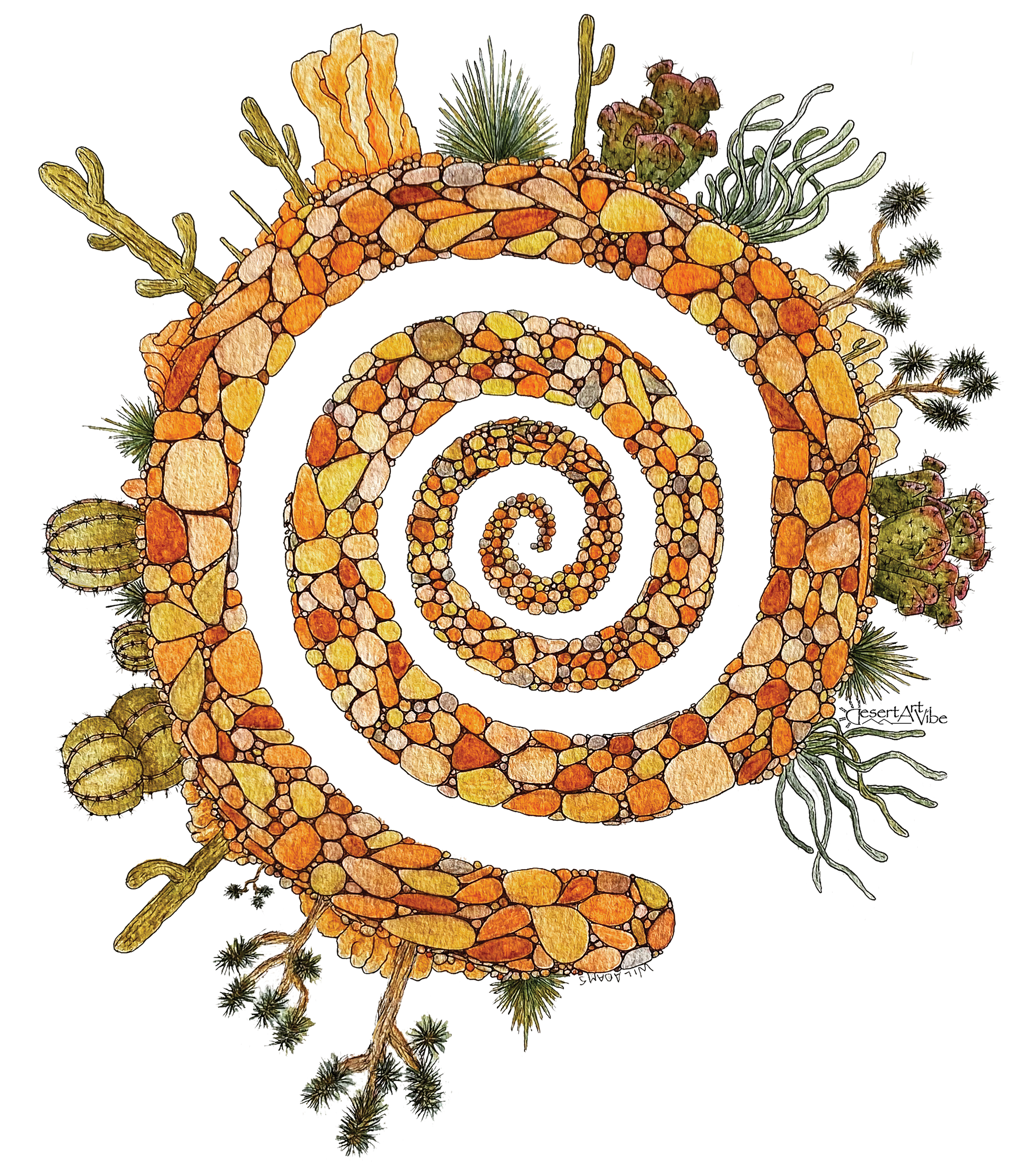 This piece was a watercolor painting and is the first of a series called Desert Vibe. Many people have also commented that it reminds them of a labyrinth. The Spiral is a sacred symbol that represents the journey and change of life as it unfolds; taking a labyrinth-like passage that leads to the Source. The spiral symbol can represent the consciousness of nature beginning from its center expanding outwardly.